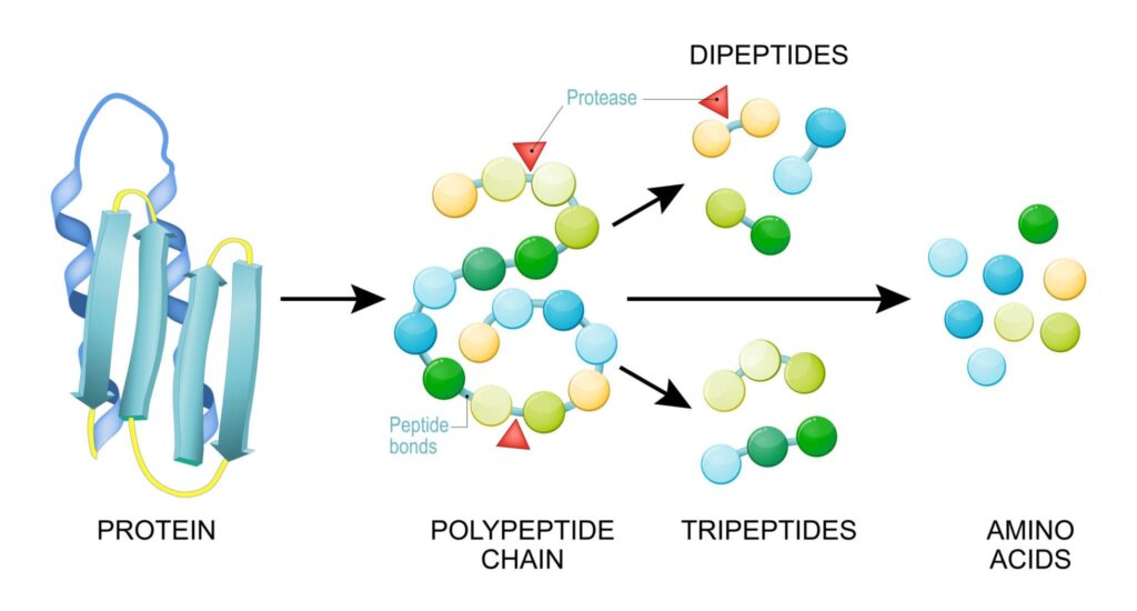 | Intestinal Phase | Jejunum, Ileum | Aminopeptidase, Dipeptidase, Tripeptidase | 7.5–8.0 | Free amino acids, small peptides |