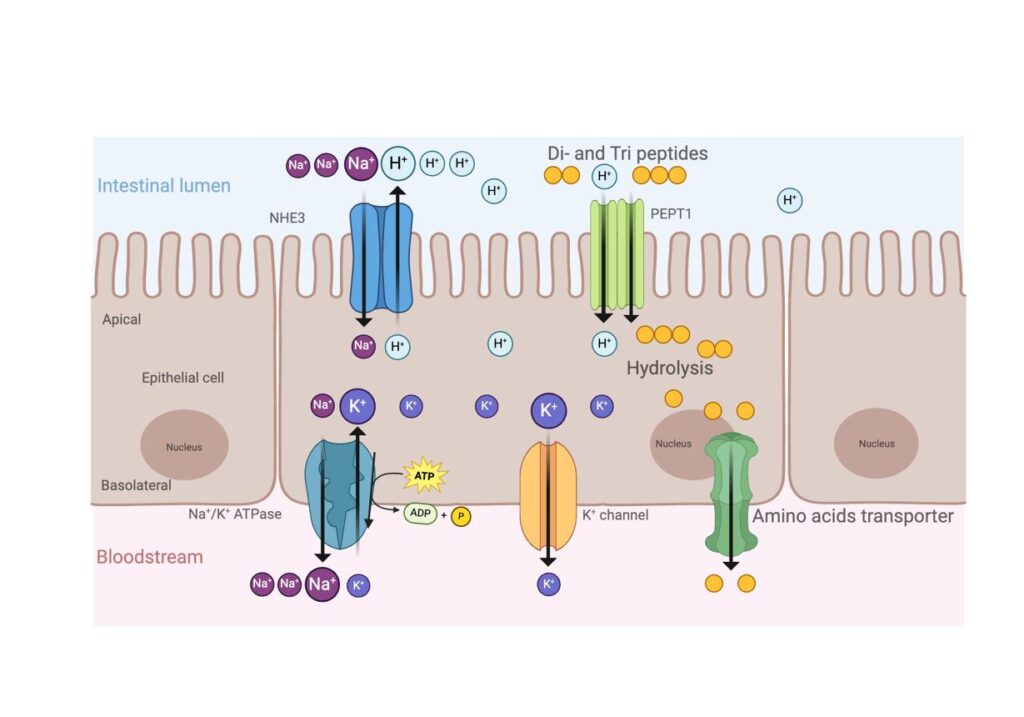 - Only amino acids and very small peptides can be absorbed through intestinal epithelial cells.